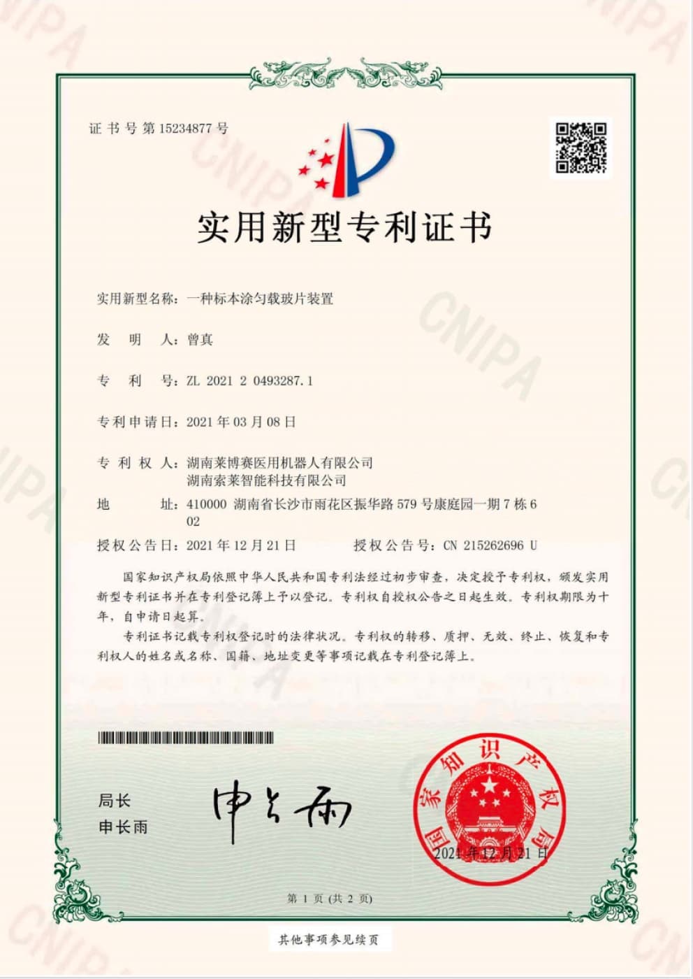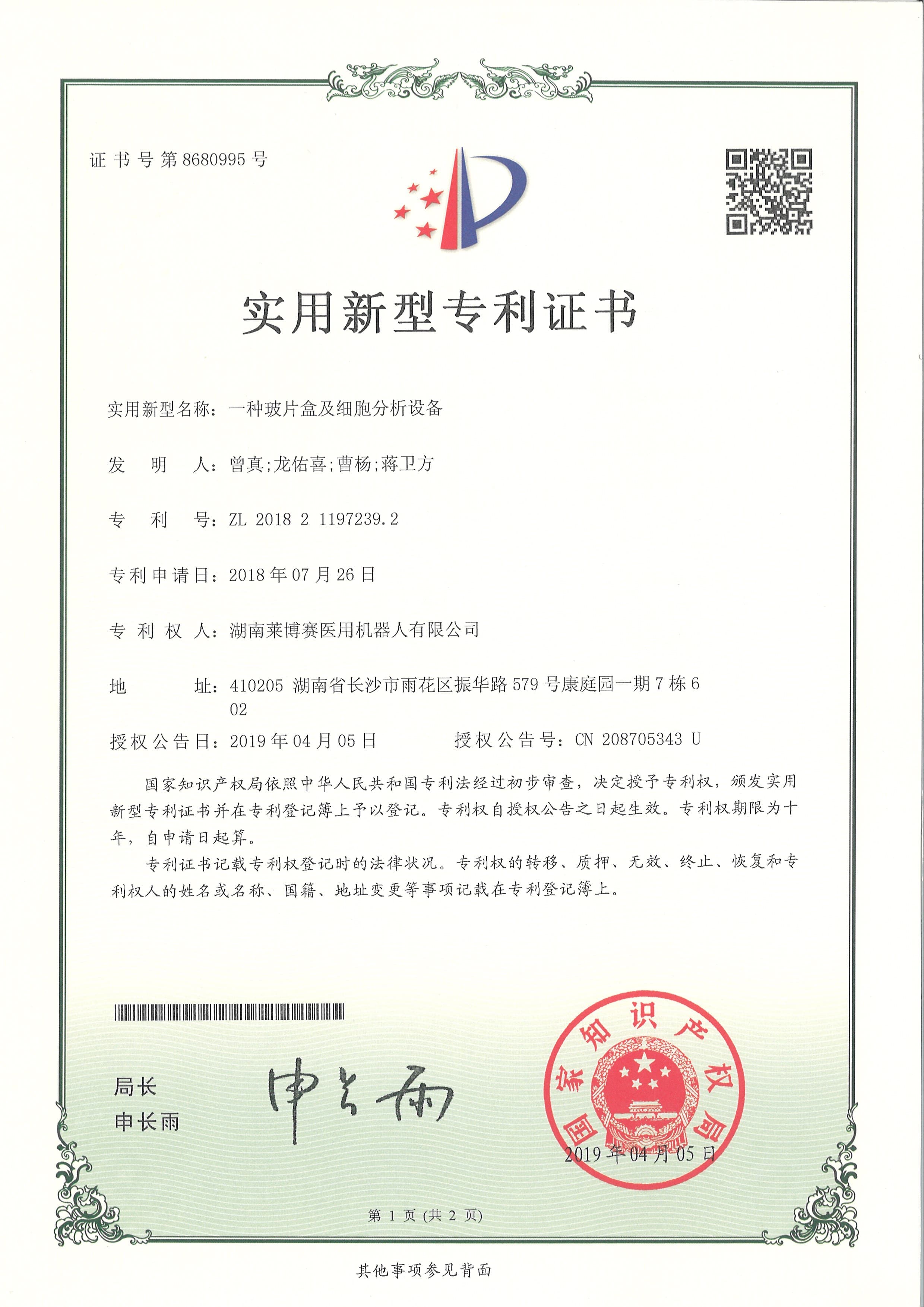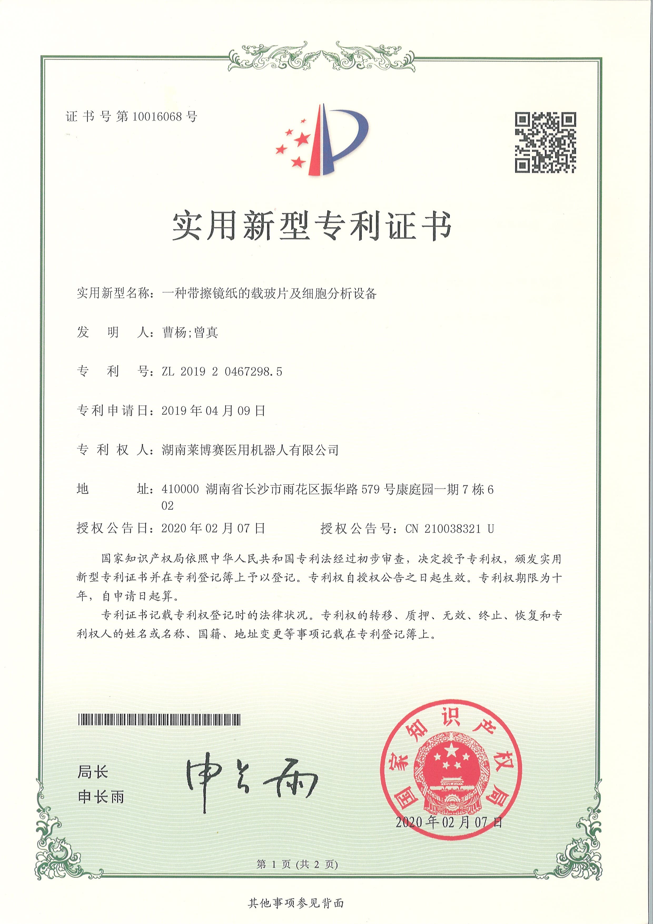 一種帶擦鏡紙的載玻片及細(xì)胞分析設(shè)備-發(fā)明專利證書 -