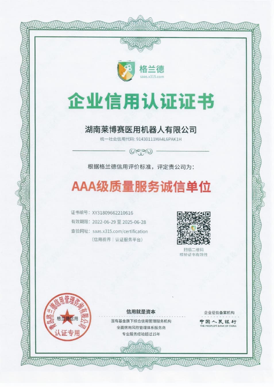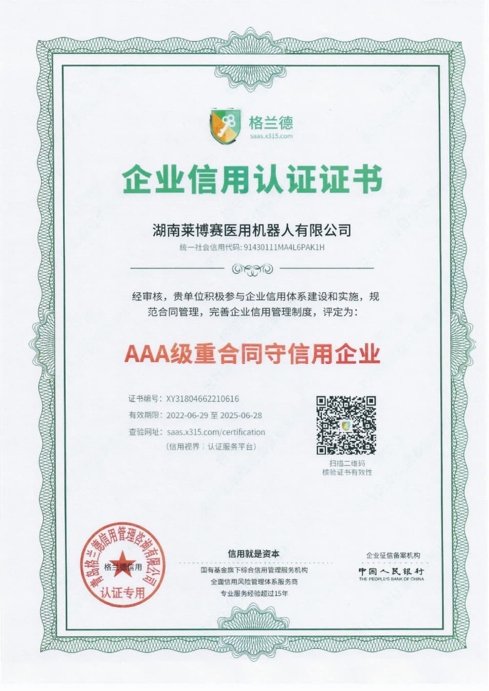 湖南萊博賽醫(yī)用機(jī)器人有限公司信用認(rèn)證企業(yè) -