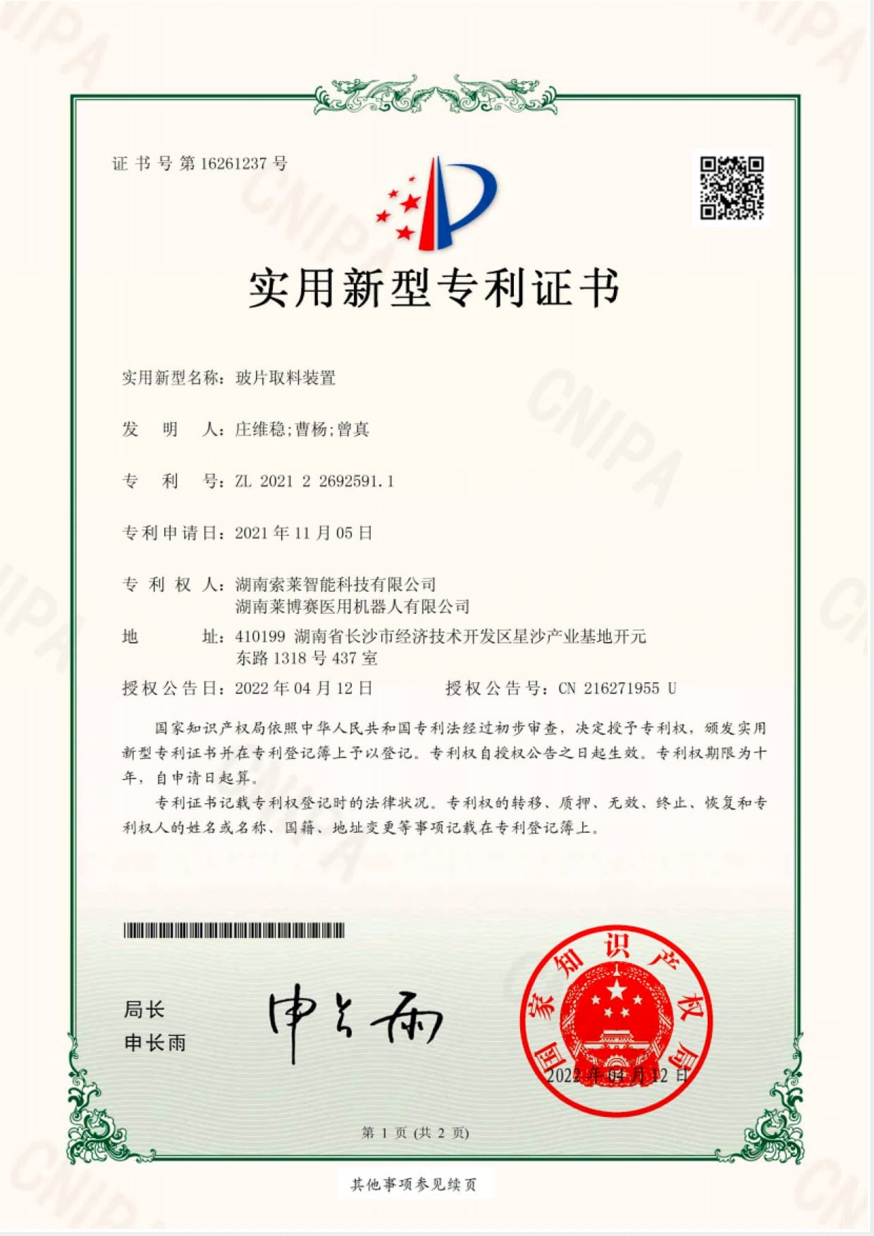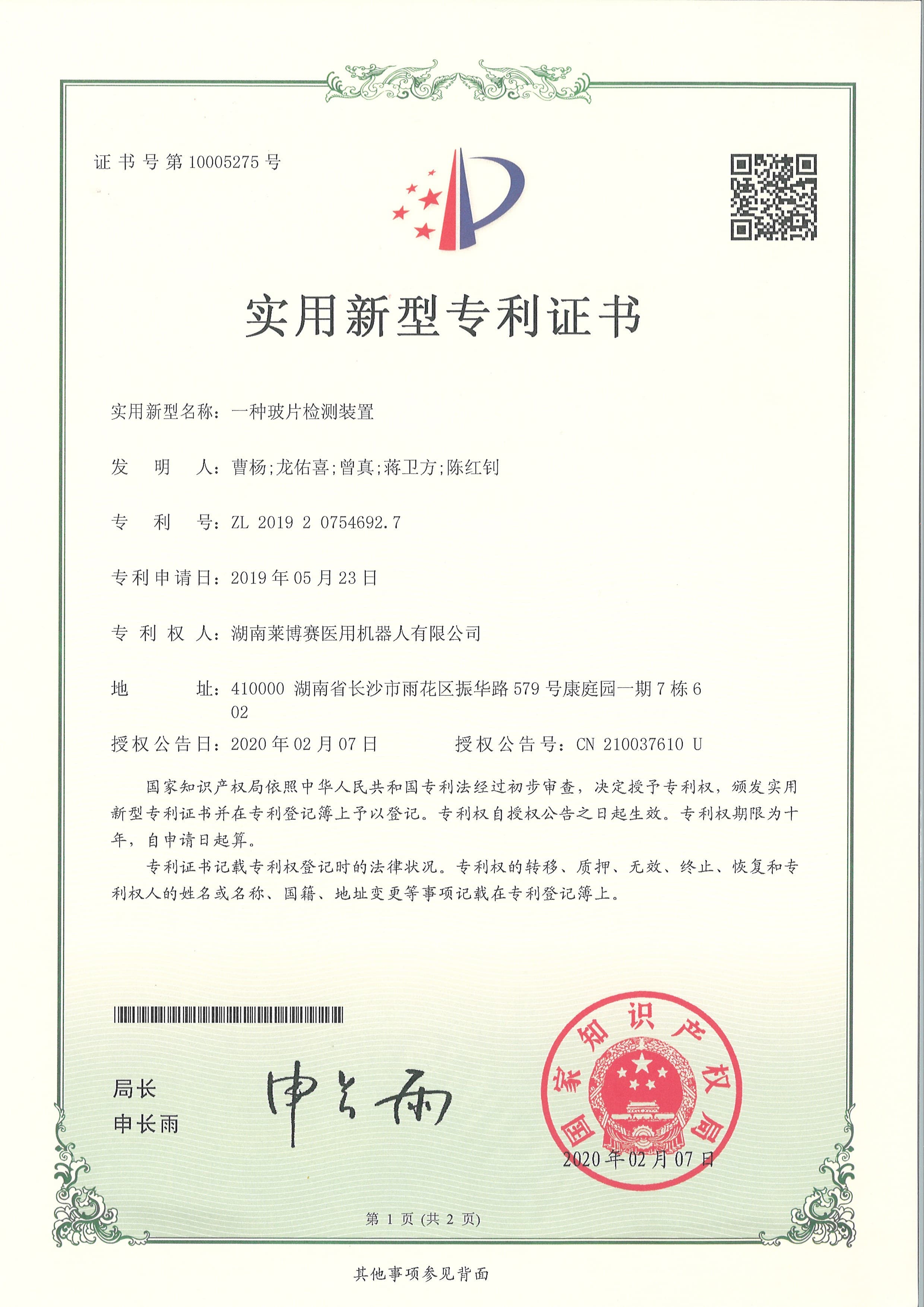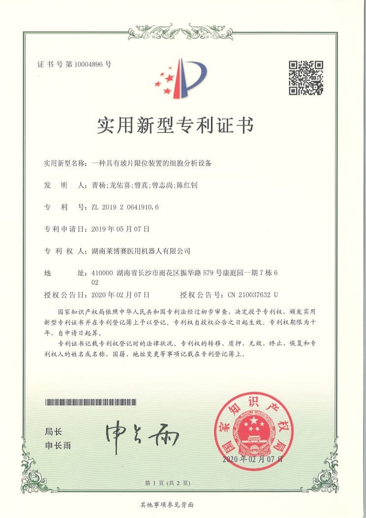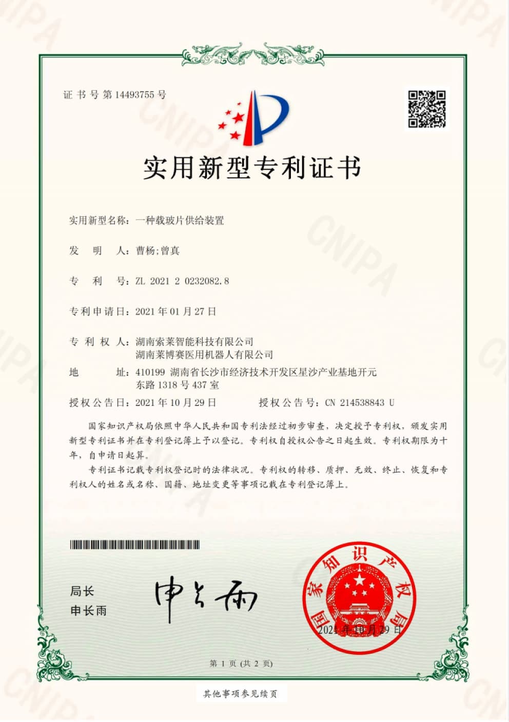 一種帶擦鏡紙的載玻片及細(xì)胞分析設(shè)備-發(fā)明專利證書 -